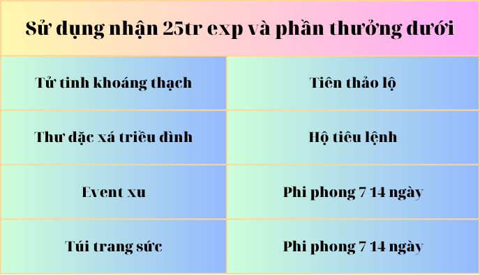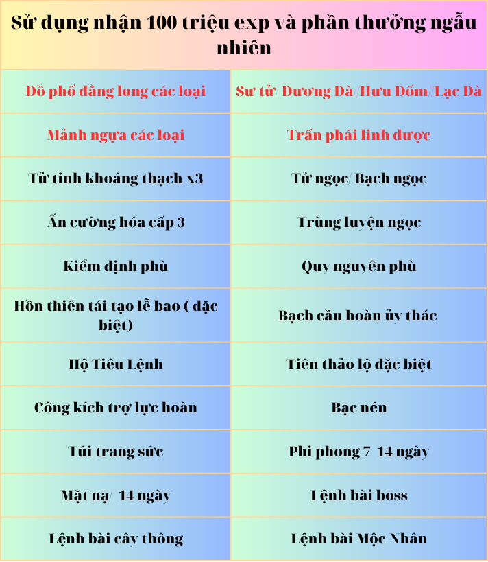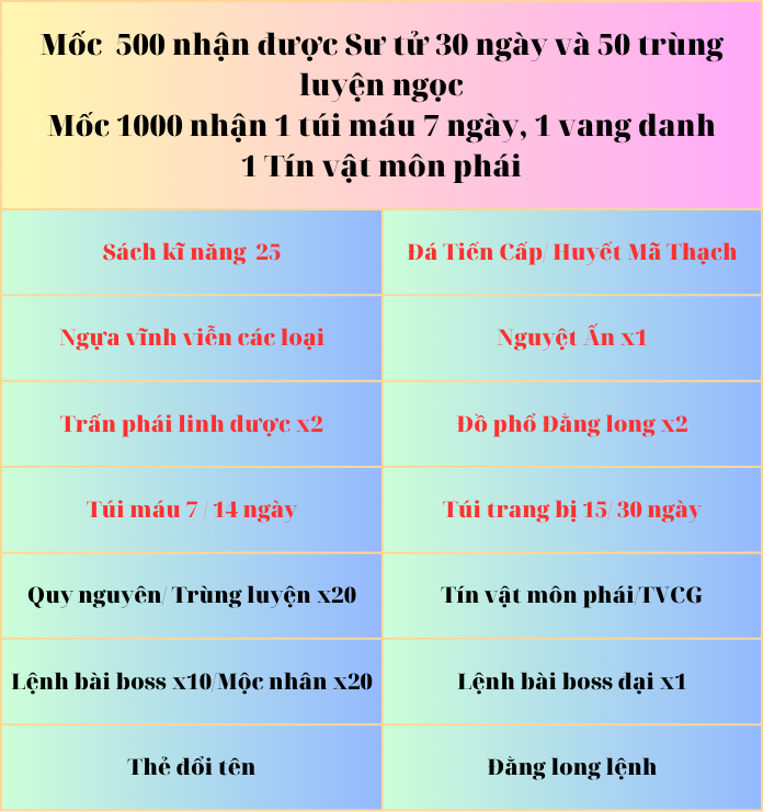 Khi đạt mốc 500 , 1000, 1500, 2000 sẽ nhận đc 4 tỉ kinh nghiệm và phần thưởng ngẫn nhiên giá trị