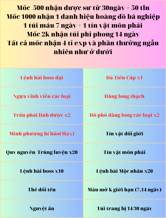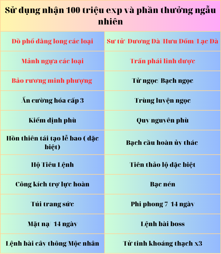 Sử dụng mỗi 500 cái ( tối đa đến 2000 cái nhận được 4 tỉ exp và phần thưởng ngẫu nhiên)
